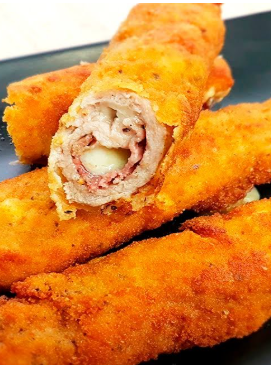 Rollos de carne de cerdo rellenos, empanados y fritos hasta quedar crujientes por fuera y jugosos por dentro.
